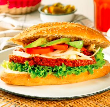 Pan de la casa, con carne deshebrada de la barda con carne de especialidad, mayonesa, aguacate y tomate.