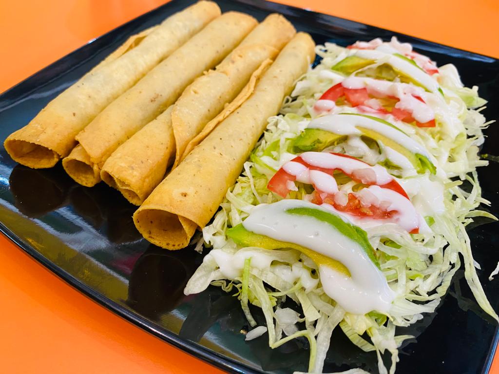 Deliciosa Orden de 4 flautas ( 2 de carne, 1 de frijol y una de papa). Acompañada de lechuga, tómate, cebolla, aguacate, crema, salsa y zanahorias.