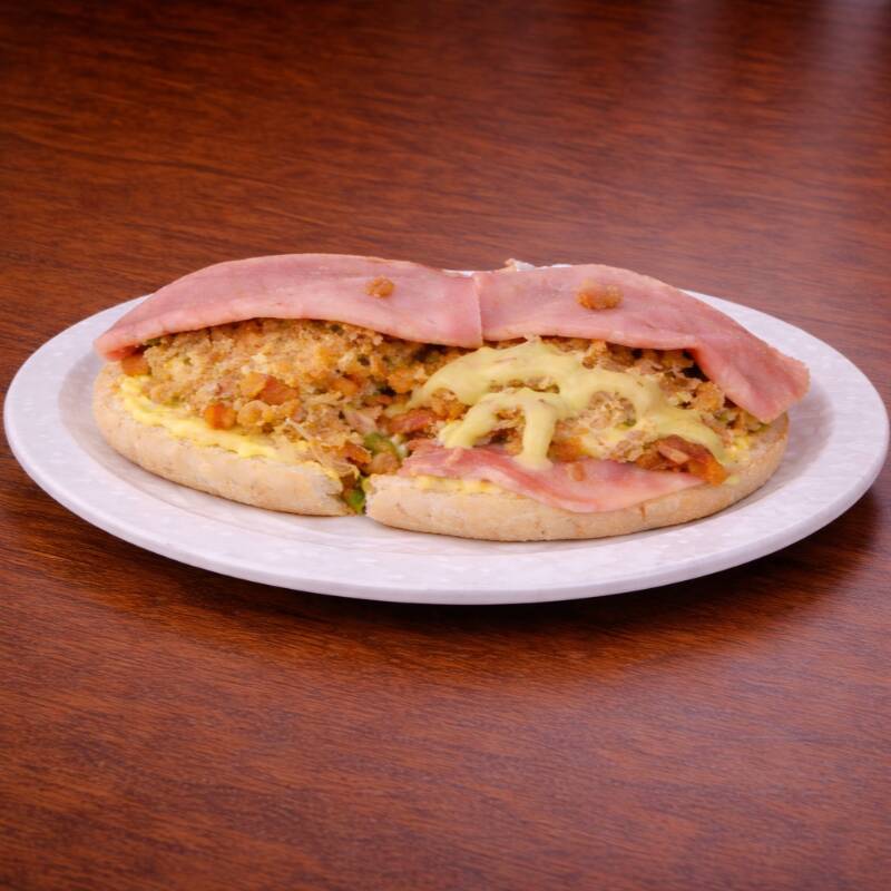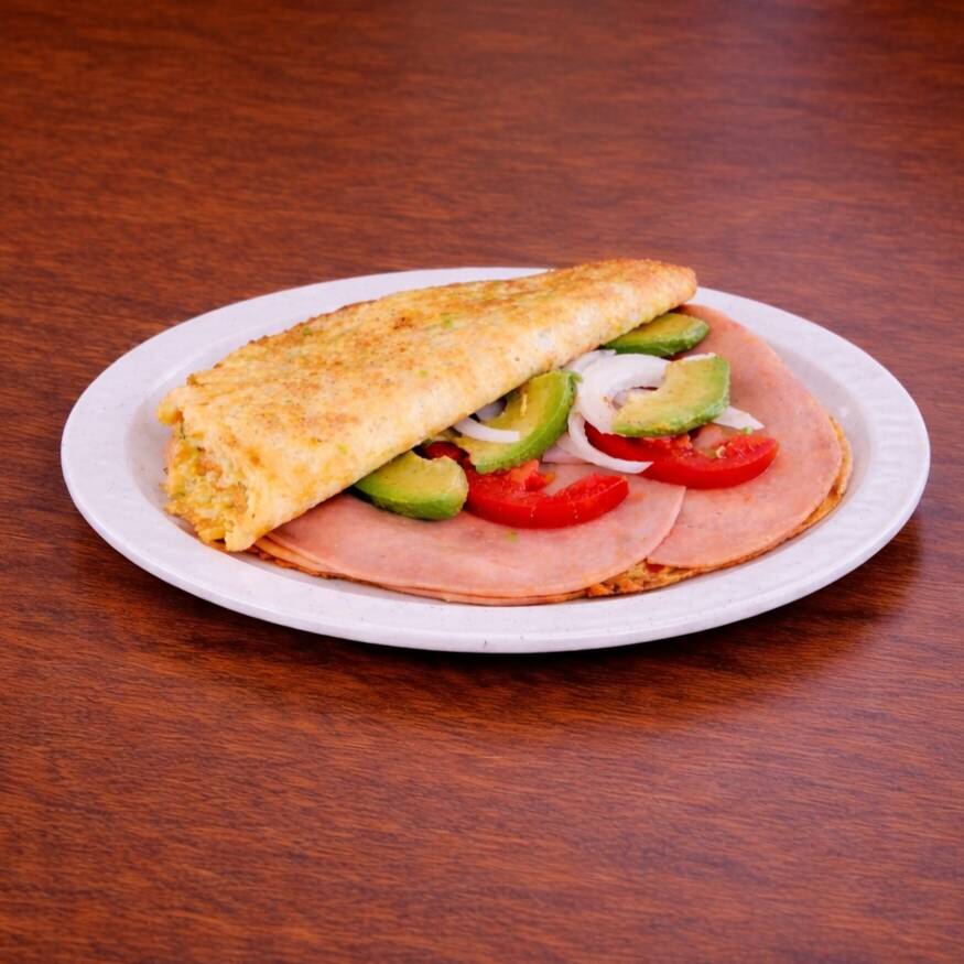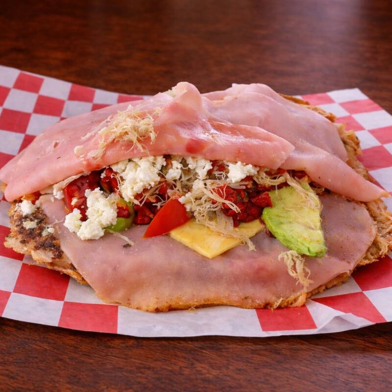 Jamón, queso amarillo, carne deshebrada, chicharrón desboronado, tomate, cebolla, aguacate y aderezo casero.