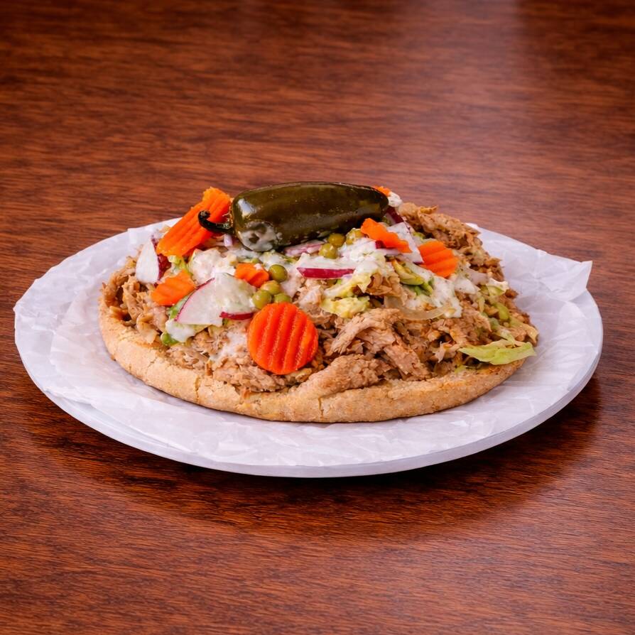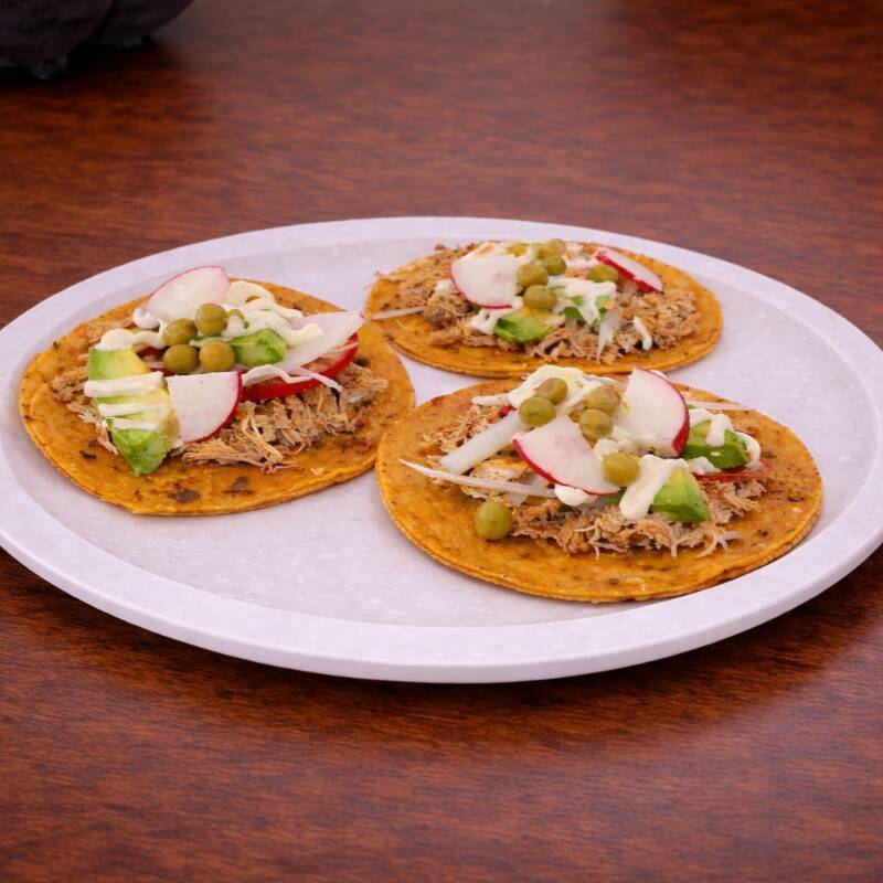 Doble tortilla, Carne de puerco, crema, chícharos, tomate, cebolla al vinagre, aguacate y rábanos.