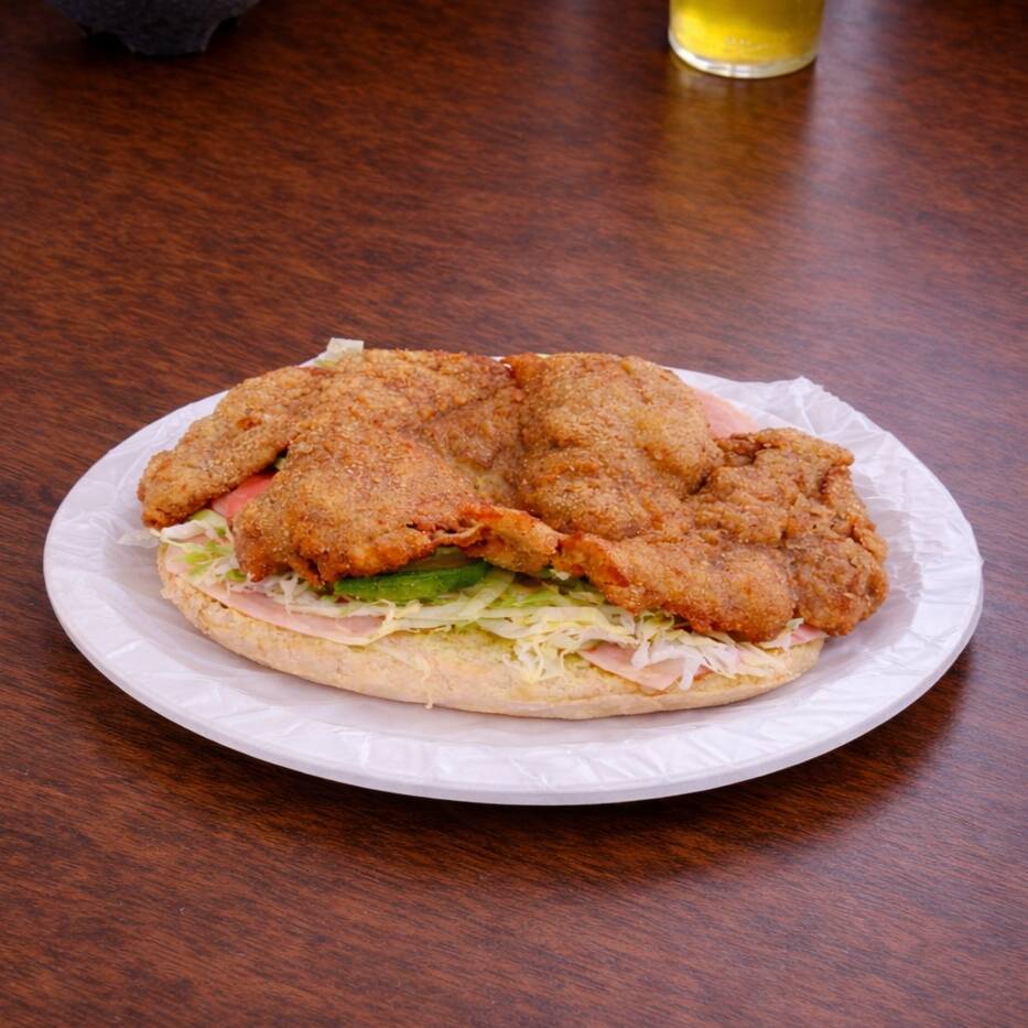 Milanesa de res o pollo, jamón, queso amarillo, frijoles, aderezo casero, lechuga, tomate, cebolla y aguacate.