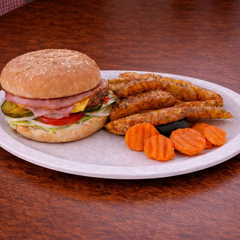 Carne de sirloin, aderezo casero, queso amarillo, jamón, tiras de tocino, lechuga, tomate, cebolla, pepinillos, catsup, zanahorias, chile en vinagre y papas sazonadas.