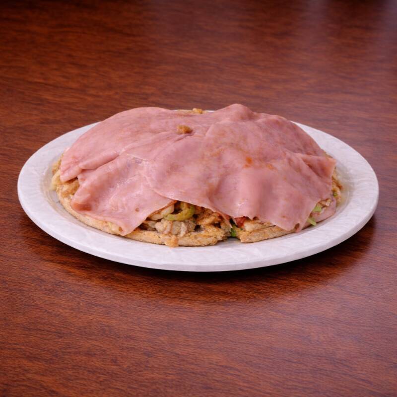 Jamón, chorizo, carne deshebrada, queso de puerco, queso blanco, frijoles, tomate, cebolla y aguacate.