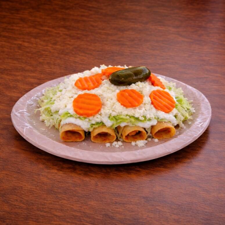 4 flautas doradas de carne de puerco, acompañadas de crema, queso, lechuga, tomate, cebolla, aguacate, zanahoria y chile en vinagre.