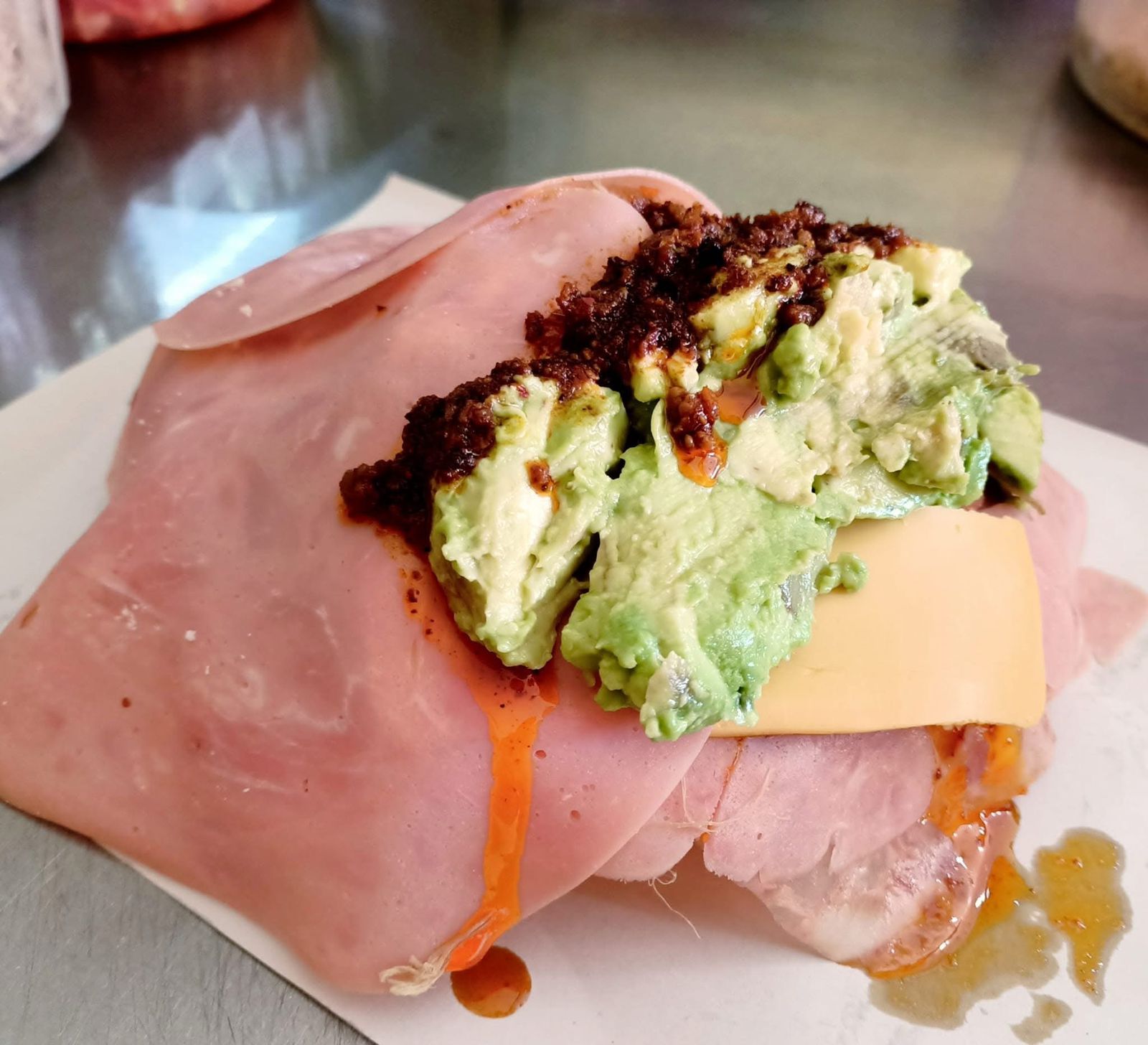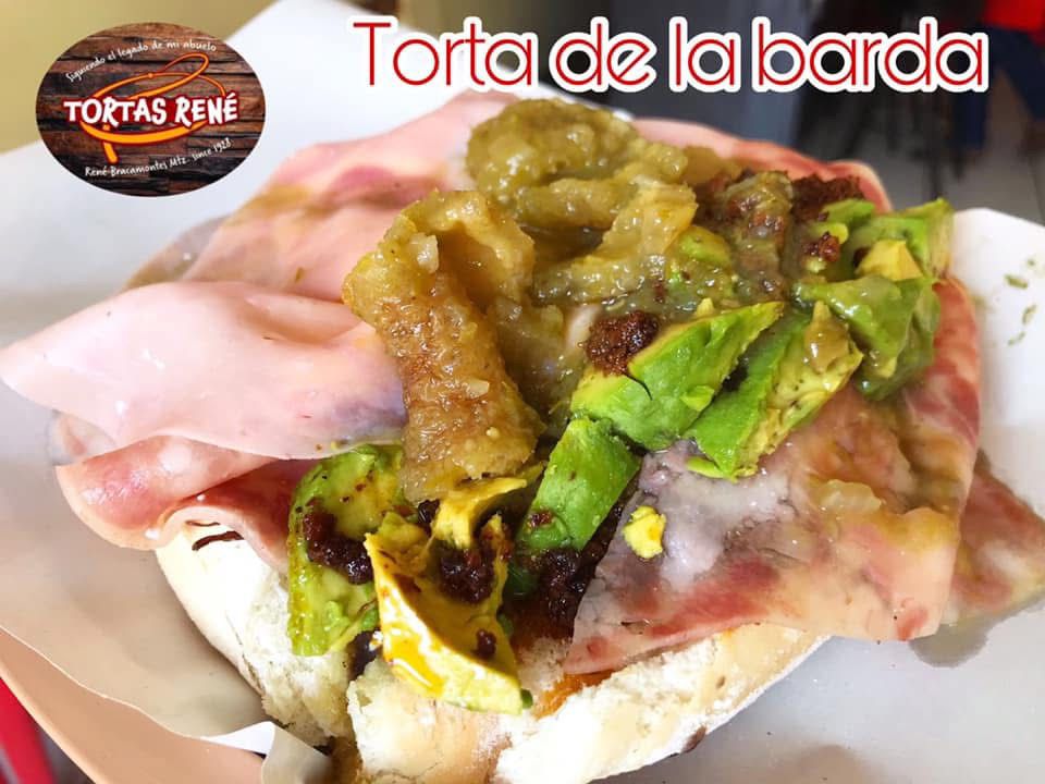 Jamón, queso de puerco, queso amarillo, carne deshebrada, frijoles, cebolla, tomate, aguacate, chorizo y salsa de chicharrón.