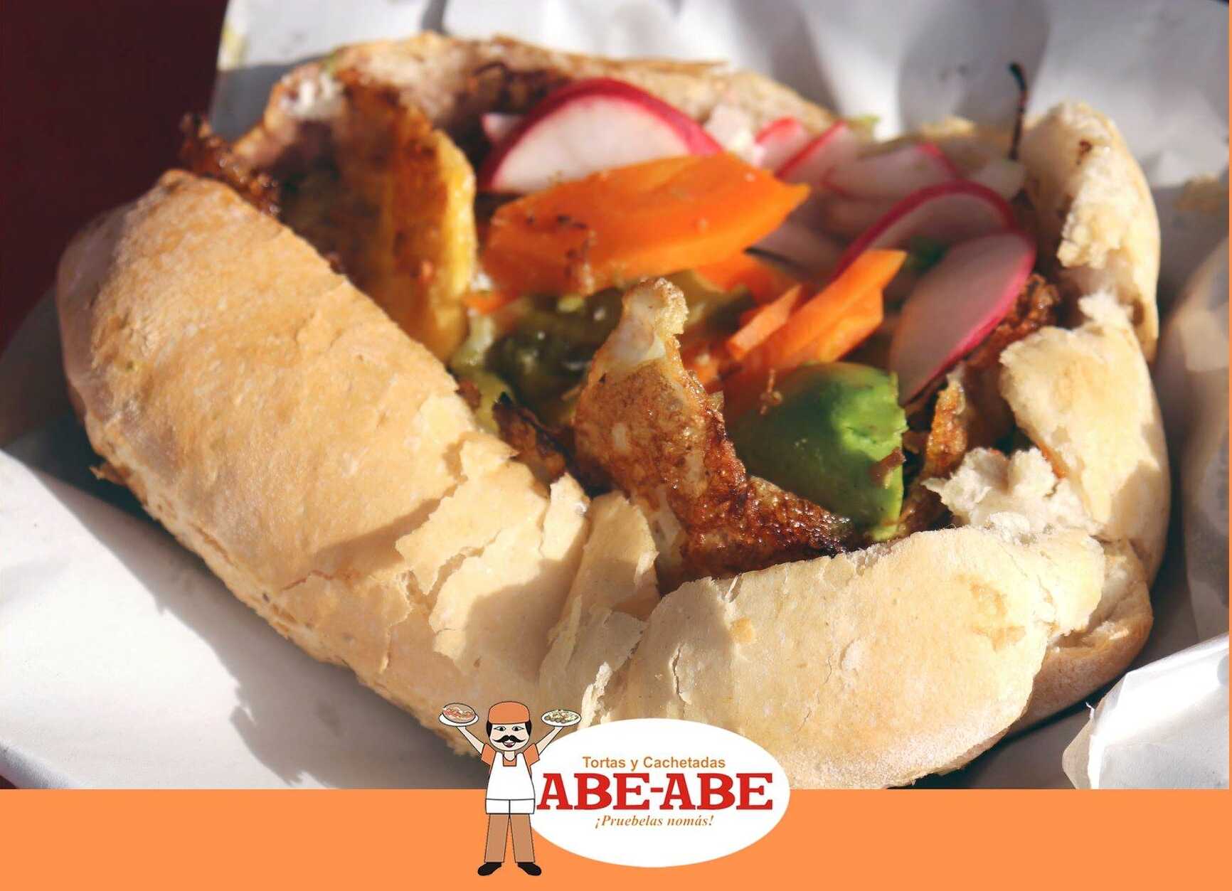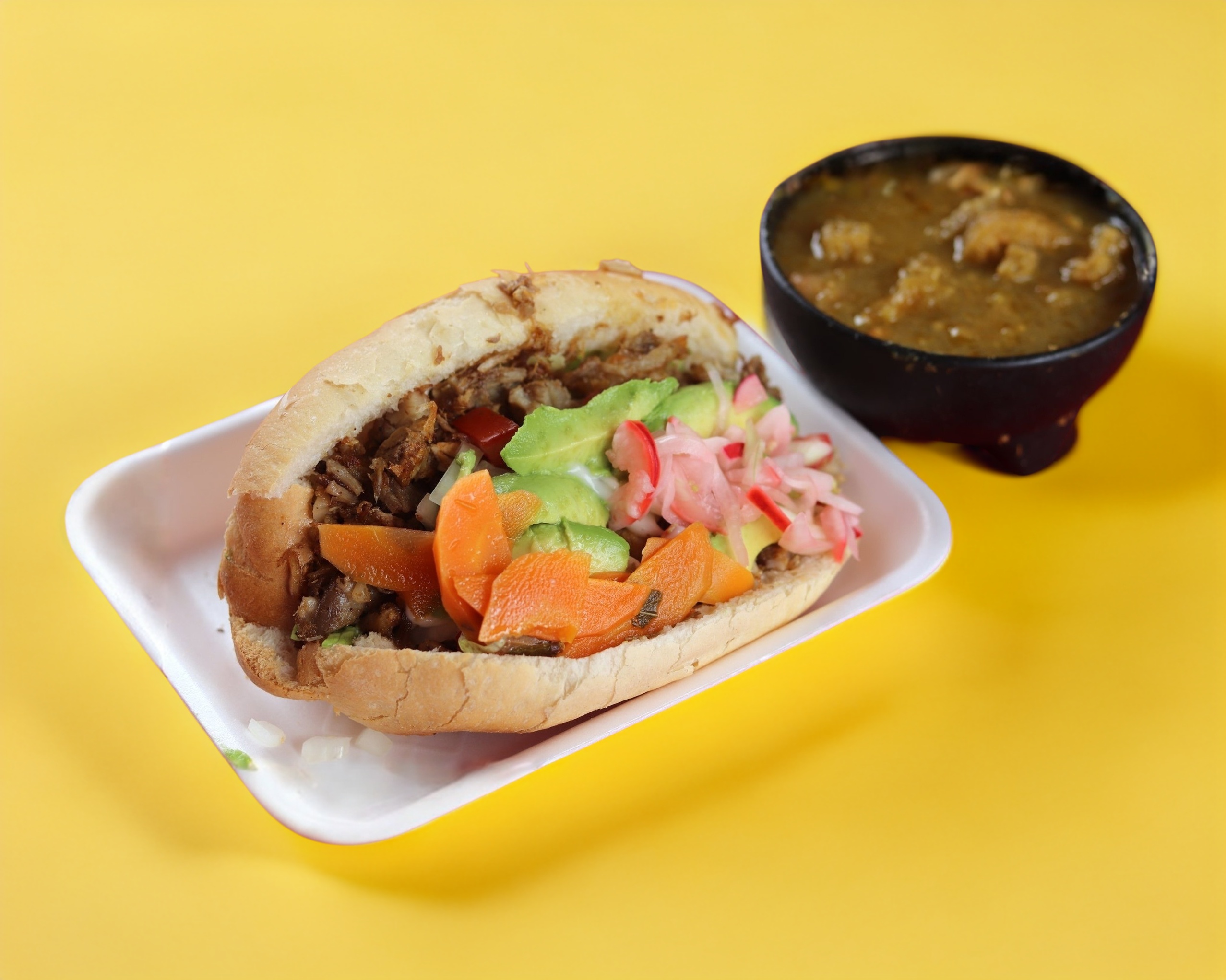 Pan francés, mayonesa, lechuga, pierna de puerco, carne deshebrada, aguacate, cebolla, tomate, zanahoria y salsa de chicharrón.