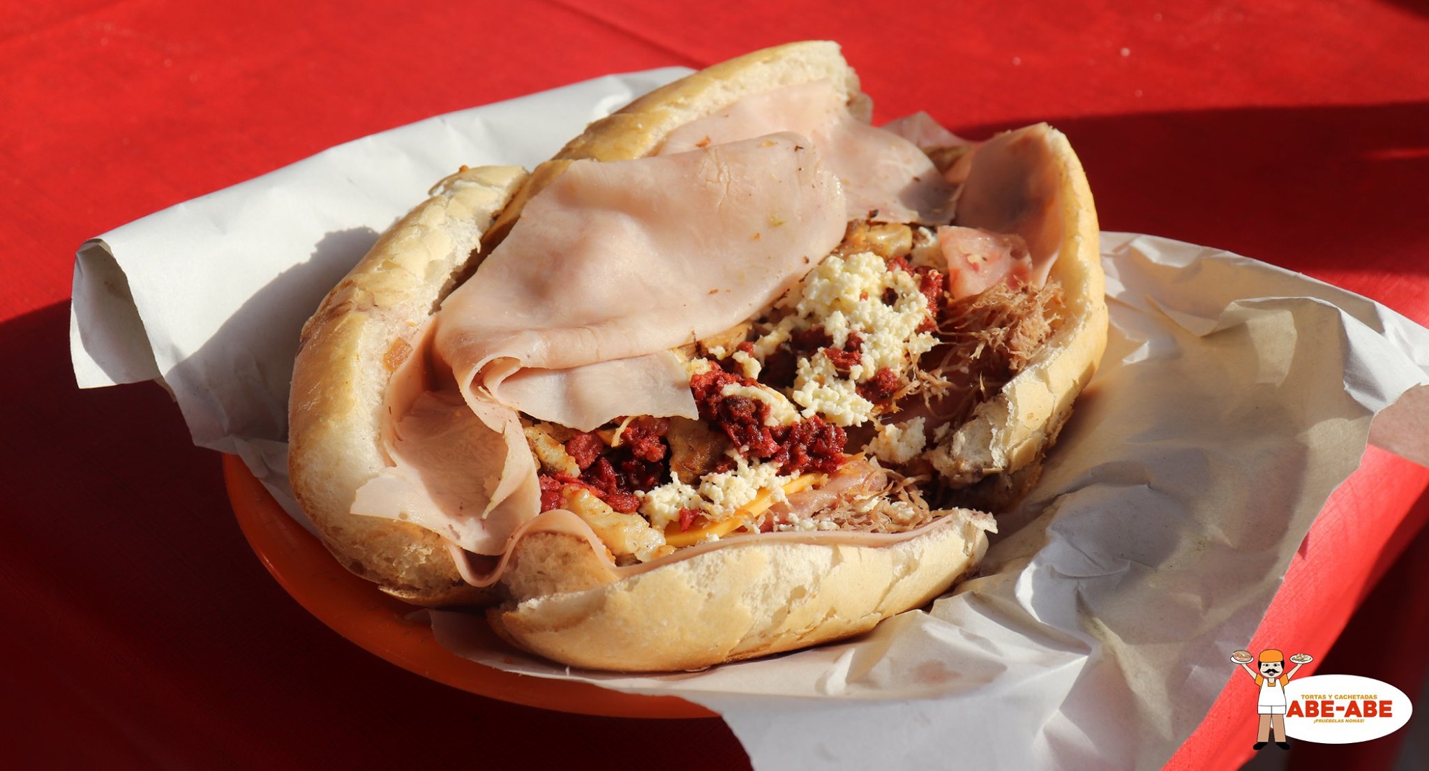 Pan francés, frijol, chorizo, jamón, aguacate, cebolla, tomate, queso de puerco, queso amarillo, salsa de chicharrón, carne deshebrada y queso molido.