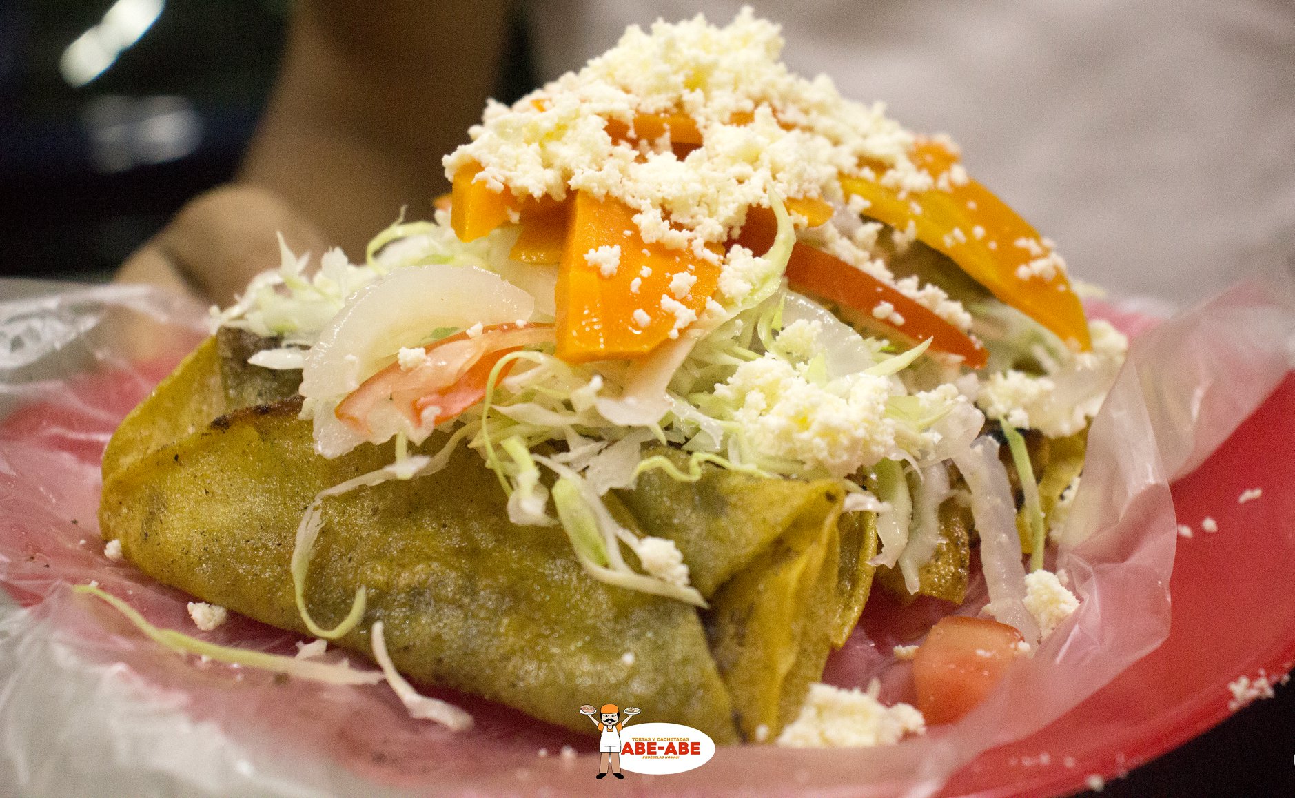 Taquitos de frijol con carne deshebrada, acompañados de repollo, cebolla, tomate, cueritos, zanahorias, queso molido y salsa roja.