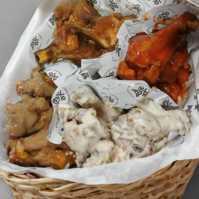 kilo de alitas, hasta 4 salsas. Incluye ranch, apio y zanahoria.