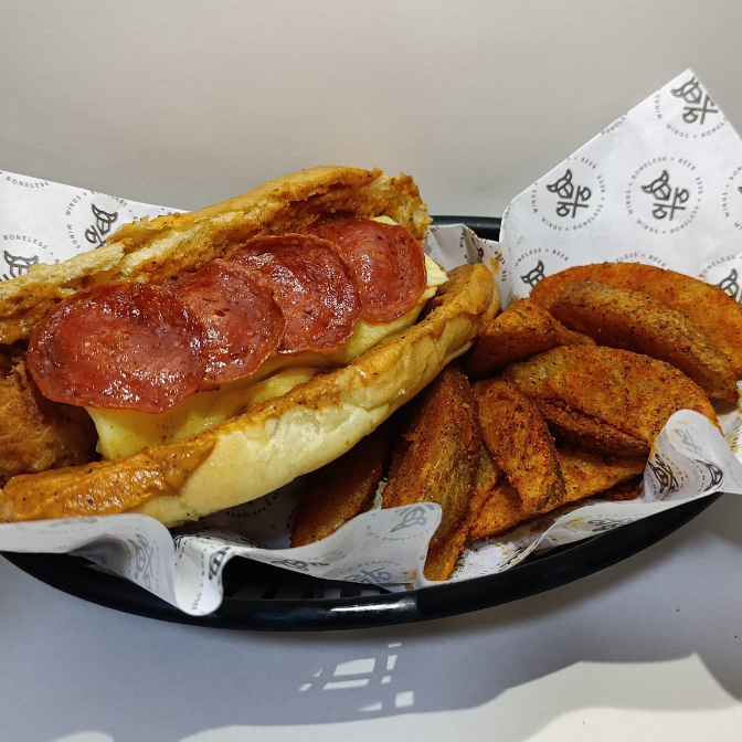 Boneless con salsa a elegir acompañados de tomate, cebolla, lechuga y queso americano en pan brioche. Aderezos: mayonesa, catsup, mostaza y bbq. Incluye papas a la francesa.