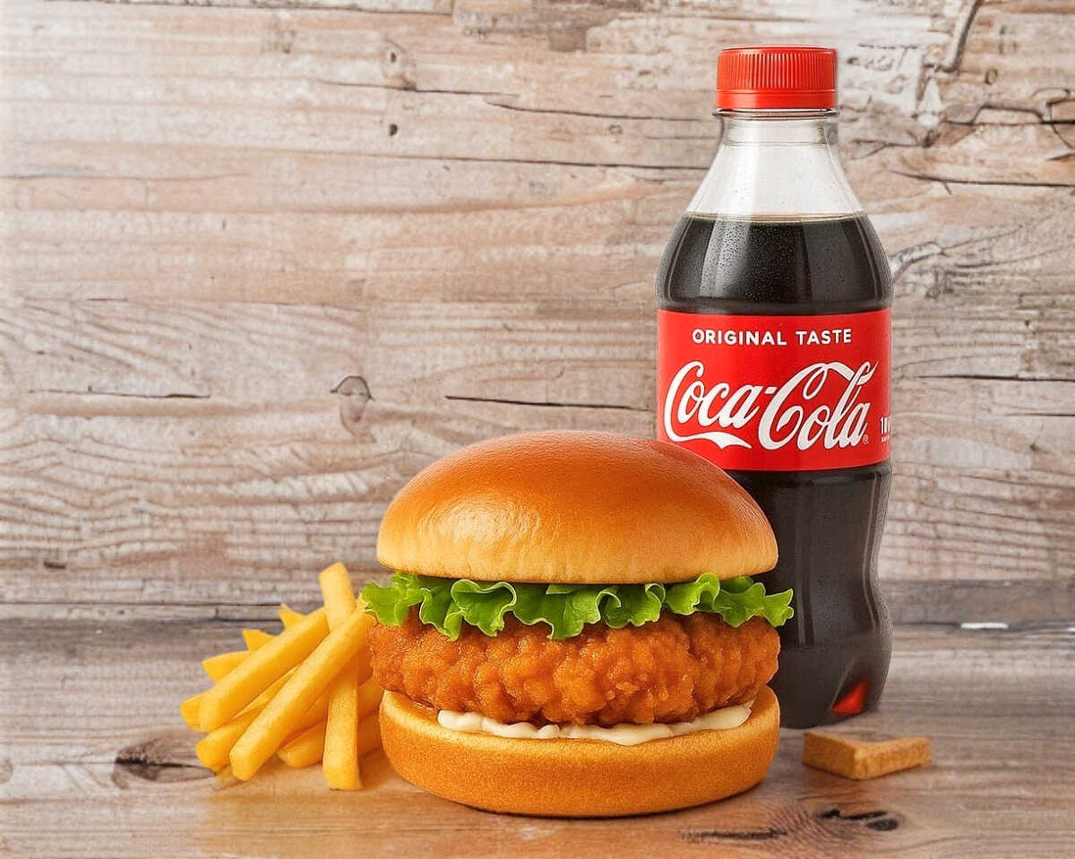 1 hamburguesa de pollo + papas + refresco 355ml.