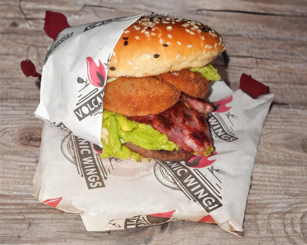 Jugosa carne de res, guacamole, tocino, queso, aros de cebolla, papas, lechuga.