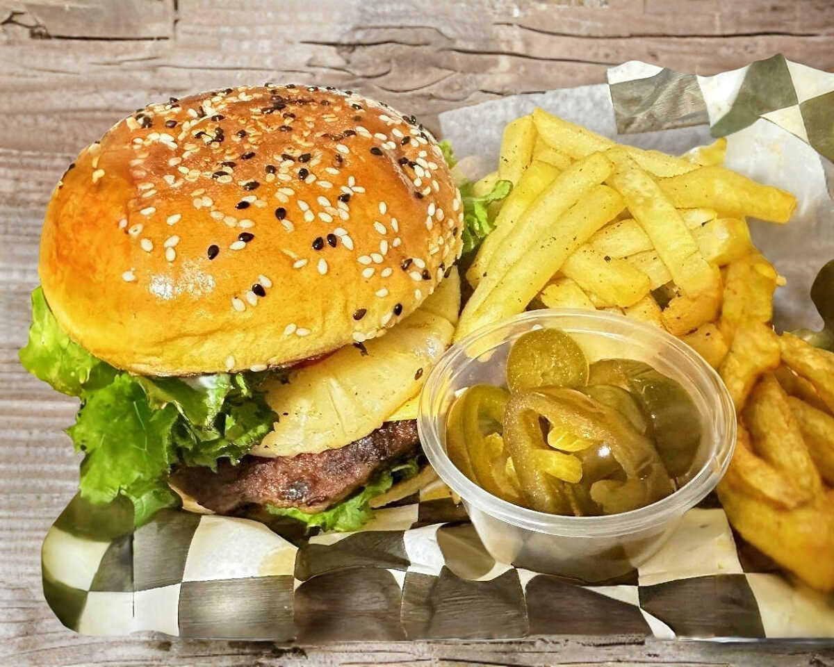 Dulce y Salada, Jugosa carne de res con piña asada, queso, papas a la francesa, lechuga, tomate y cebolla.