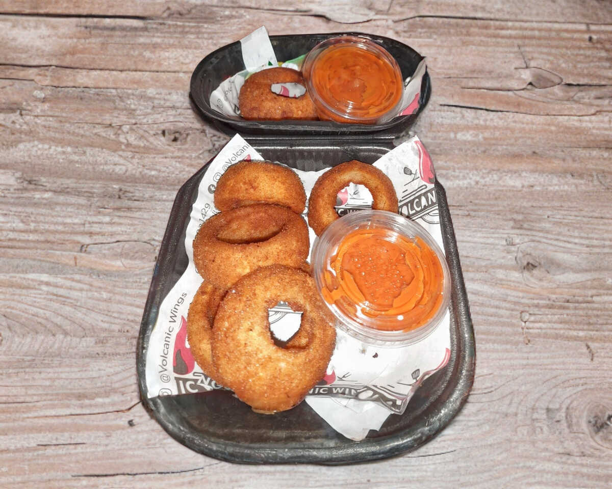 5pz de aros de cebolla recién hechos acompañados de un aderezo