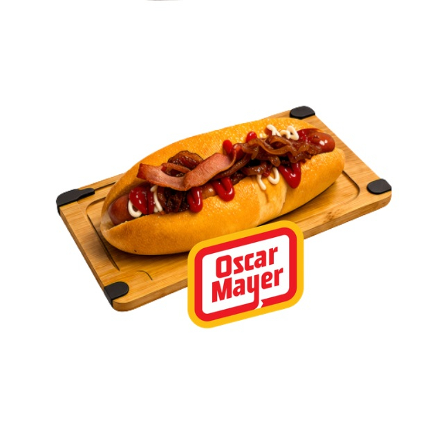 Salchicha Oscar Mayer, ensalada, jitomate, cebolla, mayonesa y catsup