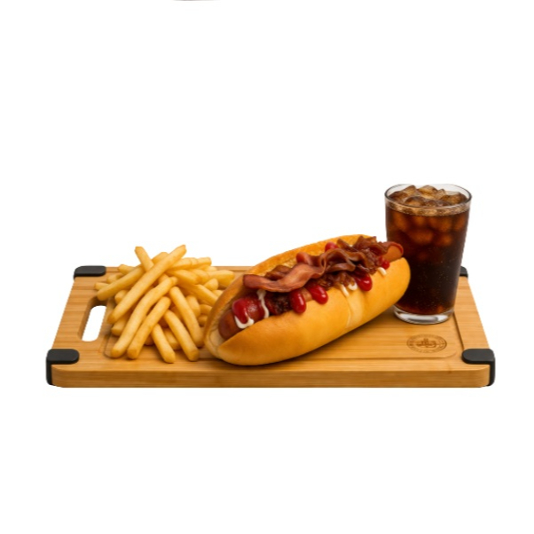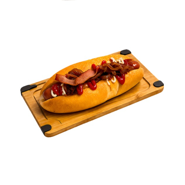 Salchicha Frankfurt, ensalada de col, tocino, jitomate, cebolla, mayonesa y catsup