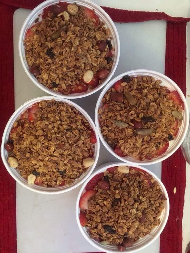 Con manzana, plátano, fresa, granola y miel.