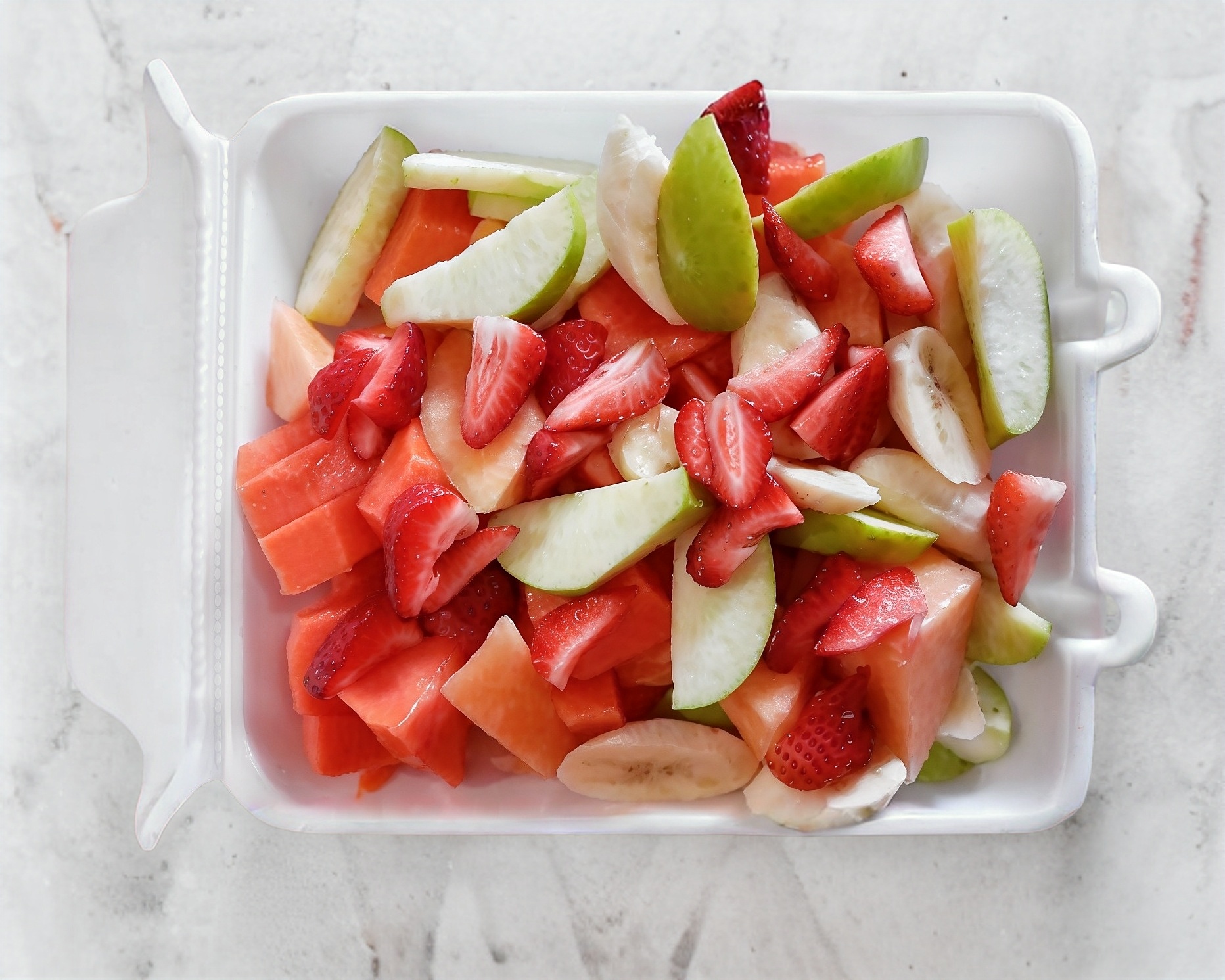 Papaya, melon, plátano, manzana, fresa, granola y miel.