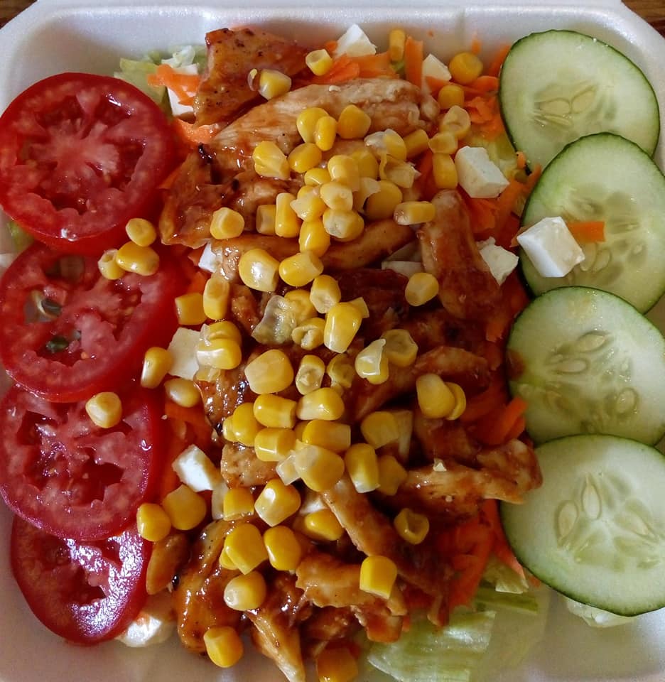 Lechuga, zanahoria, queso panela, pepino, pechuga de pollo bañada en BBQ, elote y tomate.