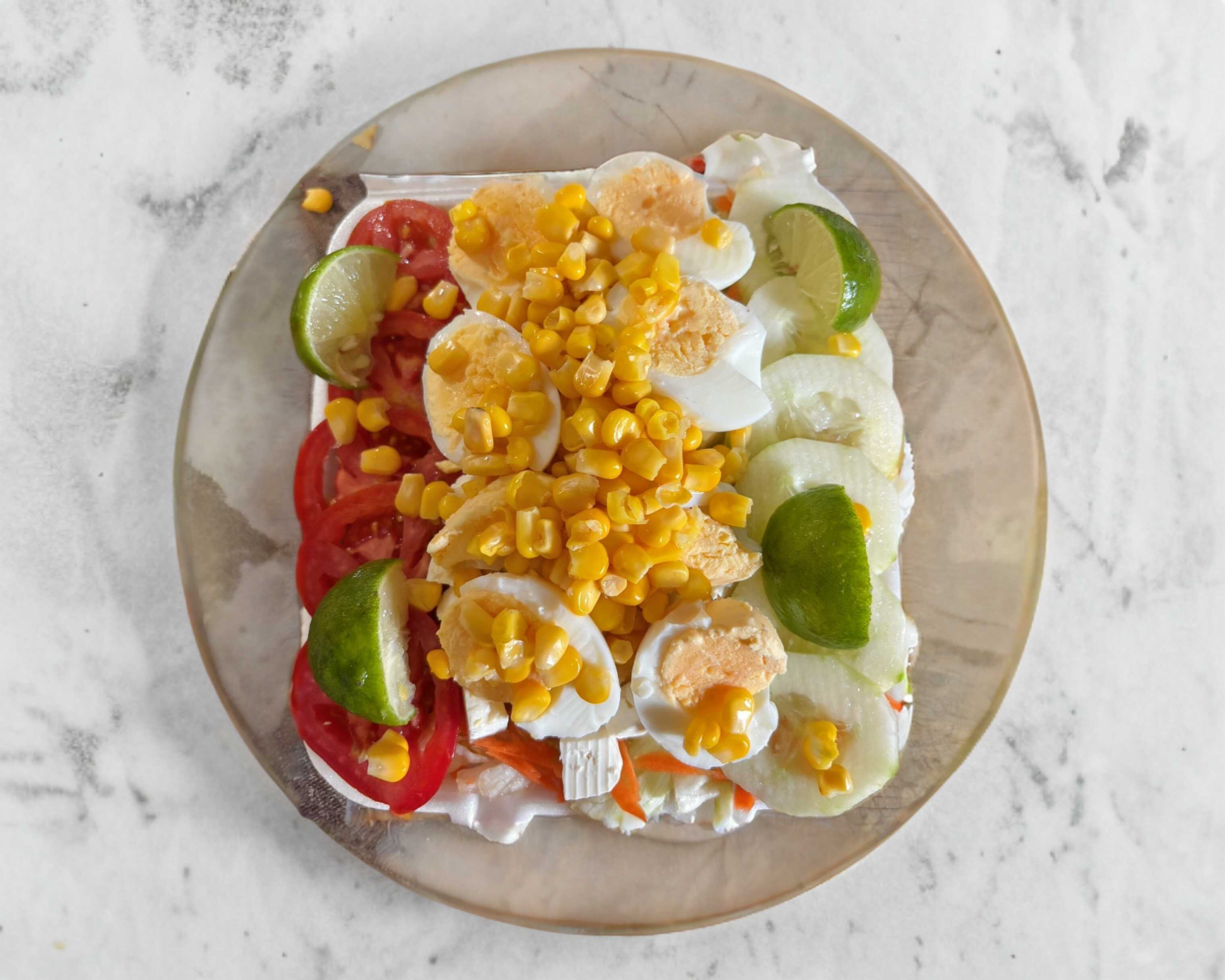 Lechuga, zanahoria, queso panela, pepino, huevos cocidos, elote y tomate.