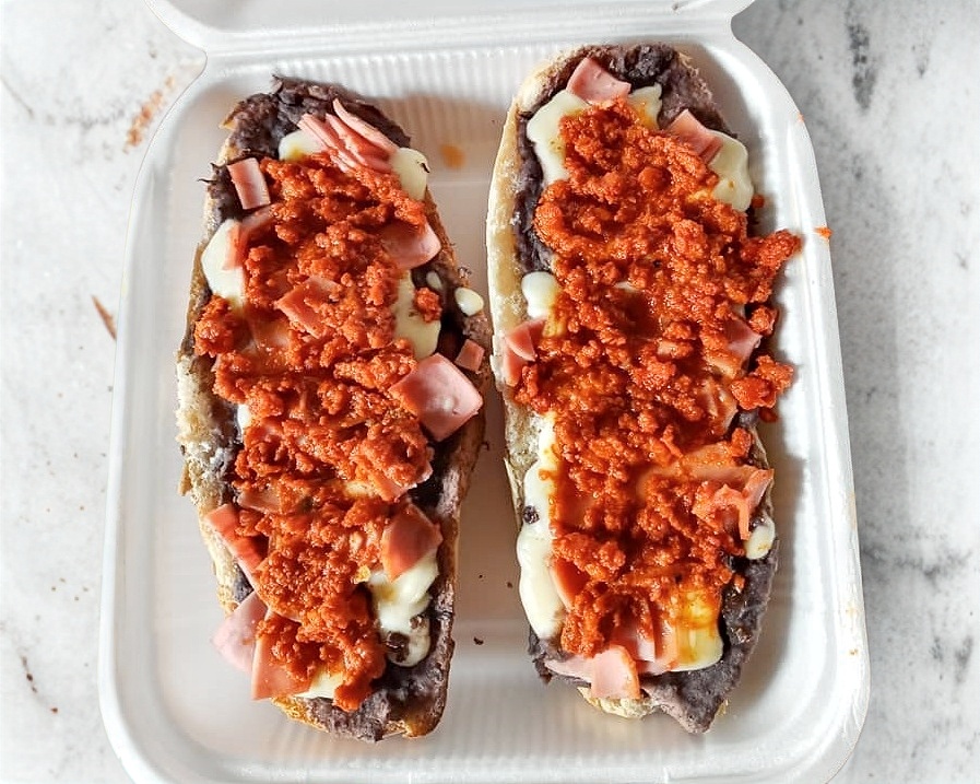 Frijoles, queso asadero, jamón y acompañados de pico de gallo.