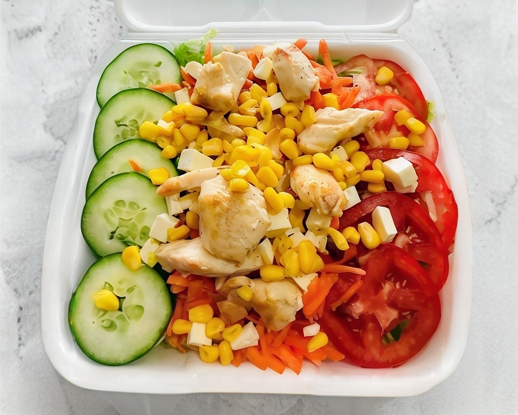 Lechuga, zanahoria, queso panela, pepino, pechuga de pollo, tomate y elote.