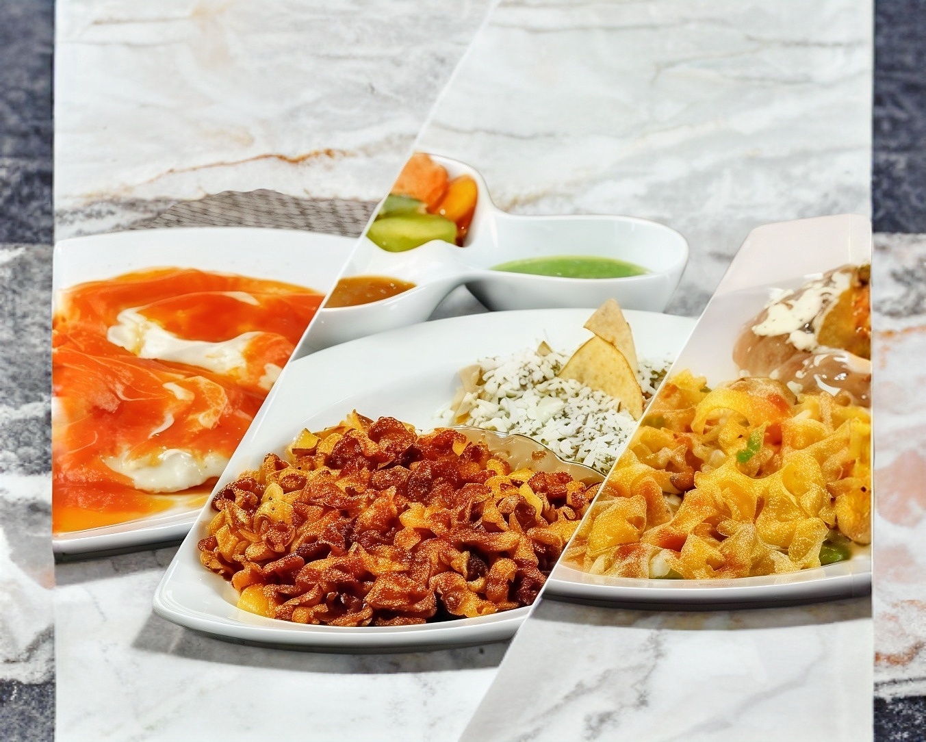 Plato fuerte, guarniciones , frijoles y salsa.