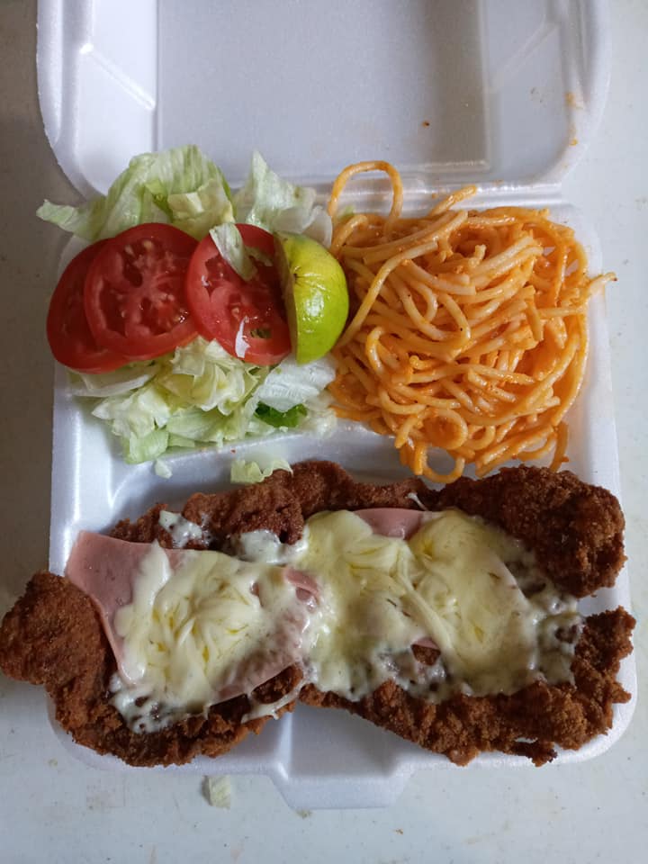 Plato fuerte (queso asadero, jamón y bañada en salsa de tomate), guarniciones, tortillas y salsa.