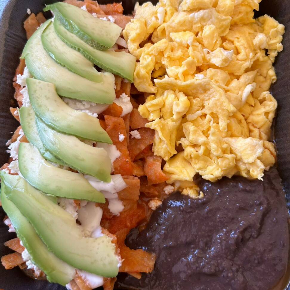 chilaquiles, huevo y frijoles con queso, crema, aguacate y cebolla
