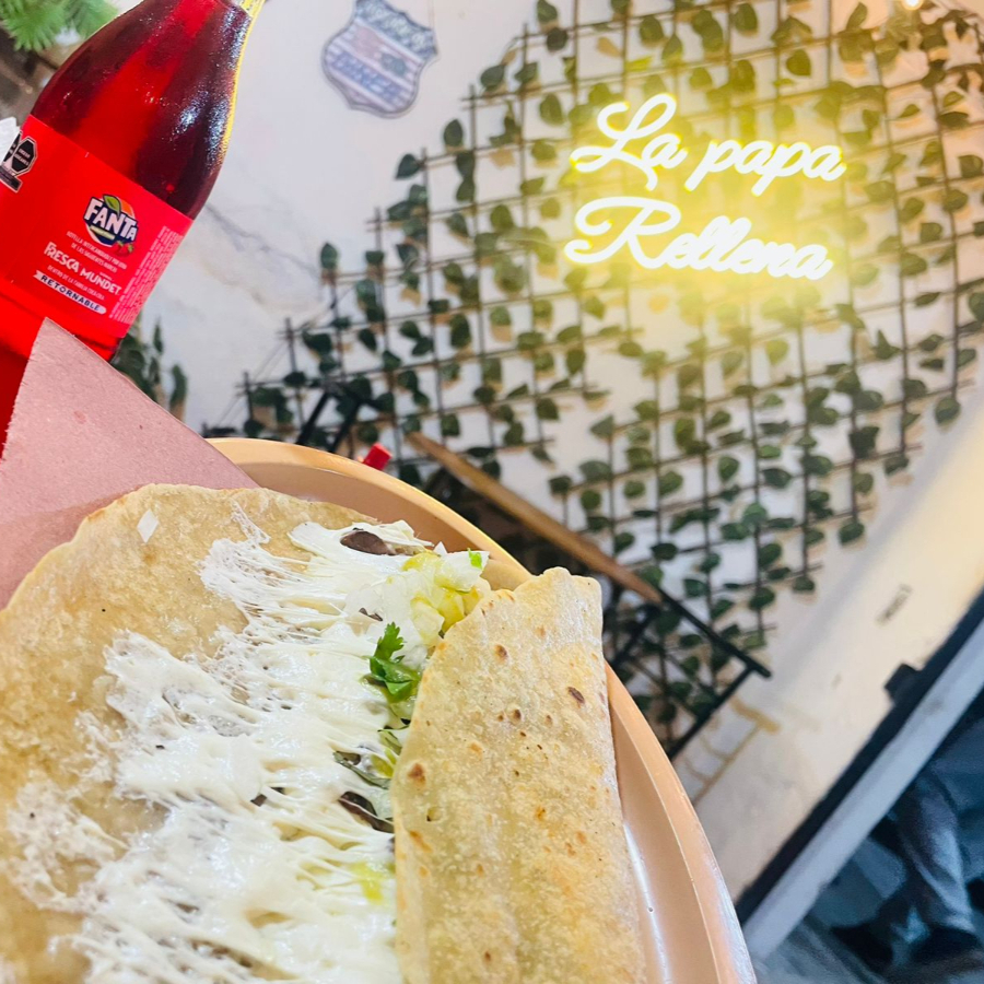 papa al carbón, con un toque de chorizo, tocino, agregando carne asada y quesillo de la región.