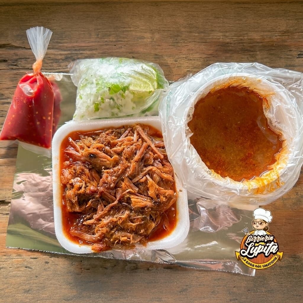 250 grs de carne desmenuzada de suculenta birria de res, cocida a fuego lento, con sus chiles y especias. Incluye todo lo necesario para disfrutarla como cebolla con cilantro, limón, nuestra salsa roja picante y ½ litro de Consomé.