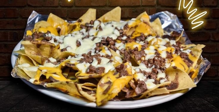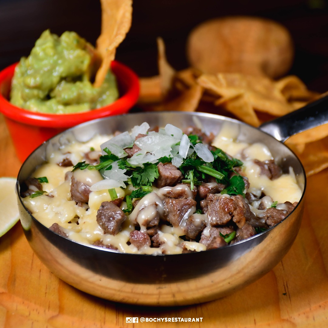 Totopos, frijoles negros refritos, arrachera y mezcla de quesos.
