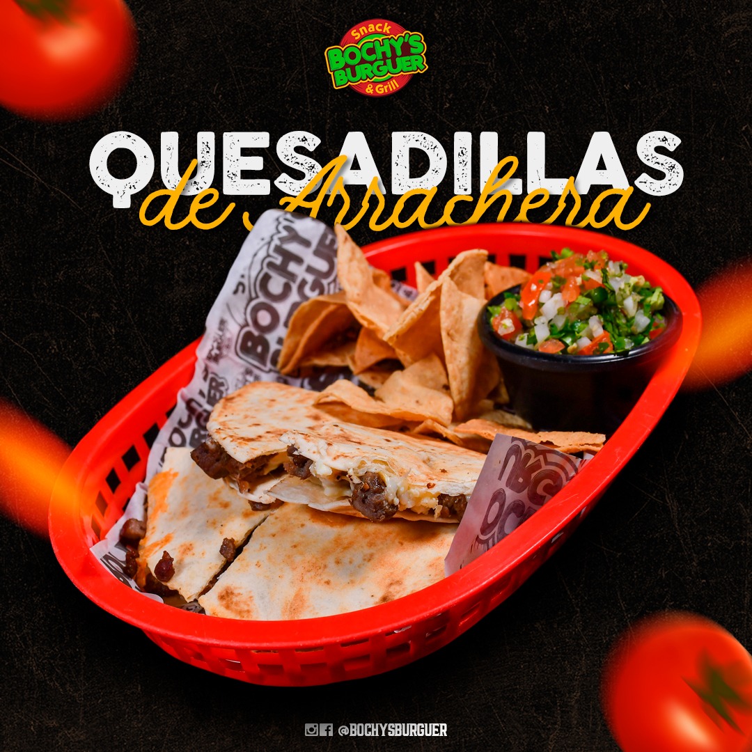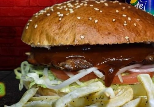 Carne de res a la BBQ, mezcla de quesos, tocino, jitomate, lechuga y cebolla.