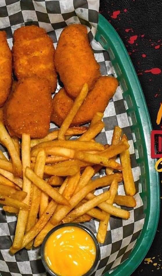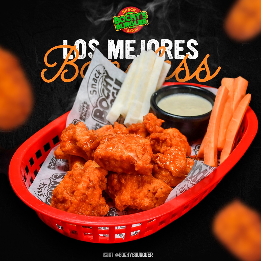 10 Boneless, 10 costillas BBQ, 2 hamburguesas cheese, 1 orden de papas a la francesa, 6 aros de cebolla, 2 aderezos y vegetales.