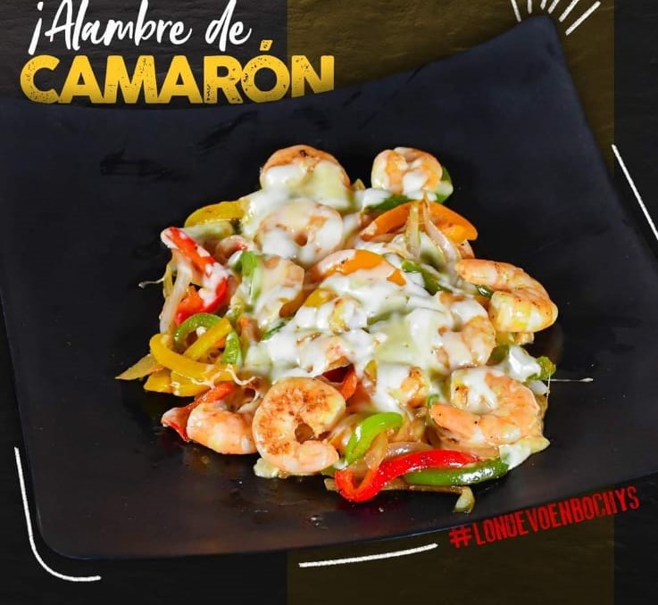 Porción de camarón, pimientos, cebolla y tocineta. Acompañado de totopos, quesadillas y salsa mexicana.