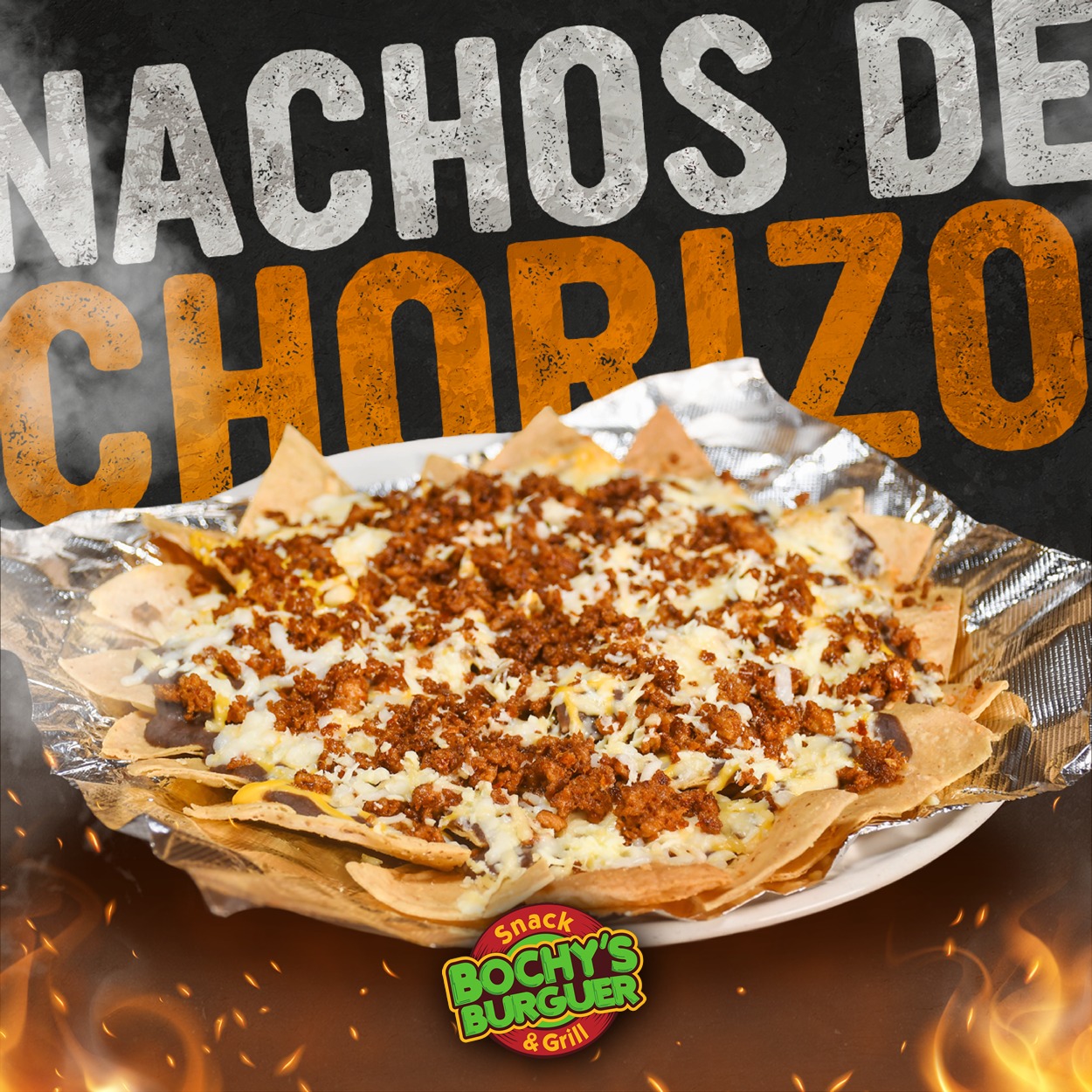 Totopos, frijoles negros refritos, chorizo y mezcla de quesos.
