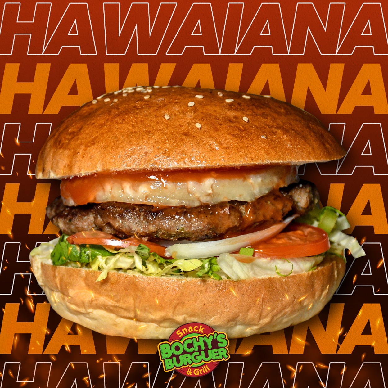 Carne de res, piña, mezcla de quesos, tocino, jitomate, lechuga y cebolla.