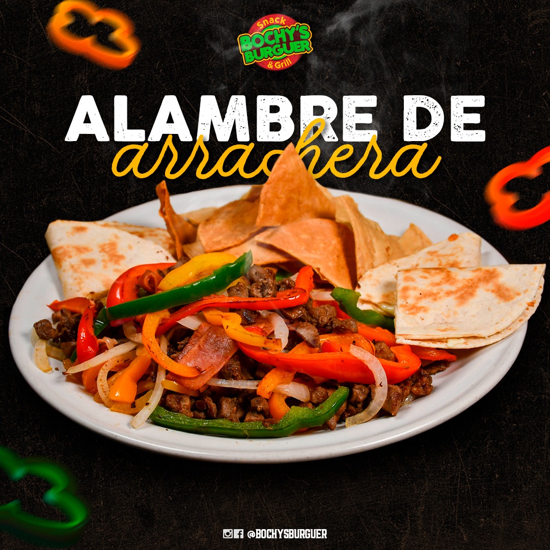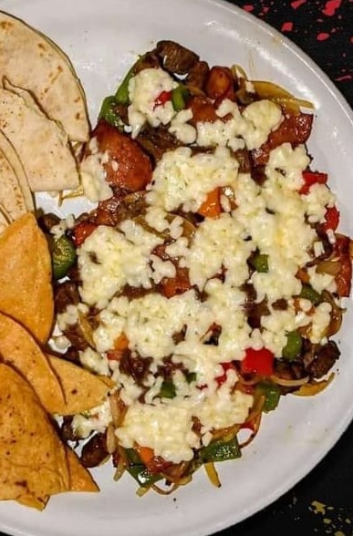Porción de carne de arrachera, pimientos, cebolla y tocineta. Acompañado de totopos, quesadillas y salsa mexicana.