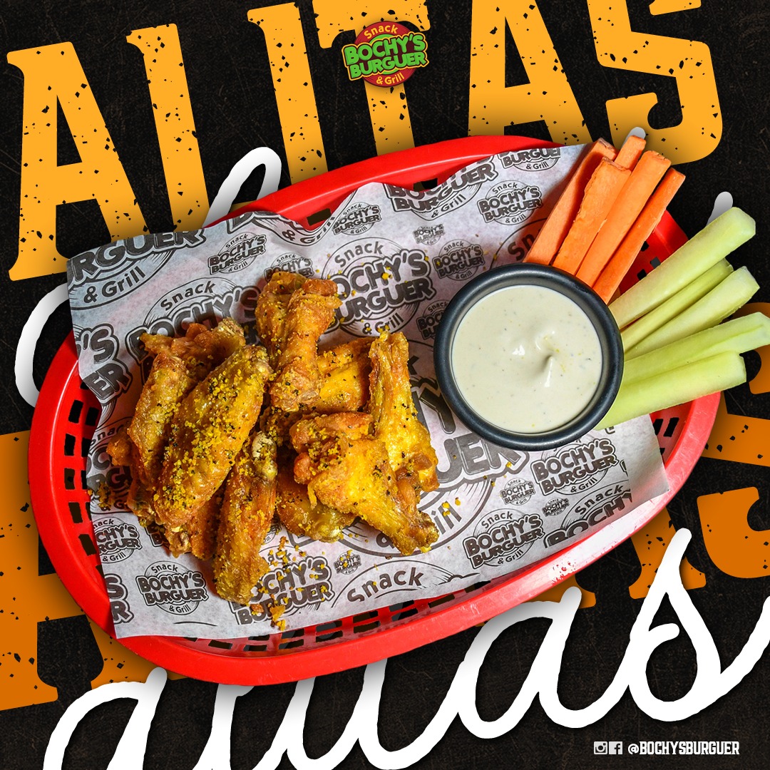 20 Alitas, 20 Costillas BBQ, 1 papas bochys, 2 aderezos y vegetales.