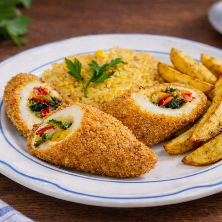 Suprema de pollo rellena de pimientos, cebolla, champiñon y zanahoria con queso, con papas fritas