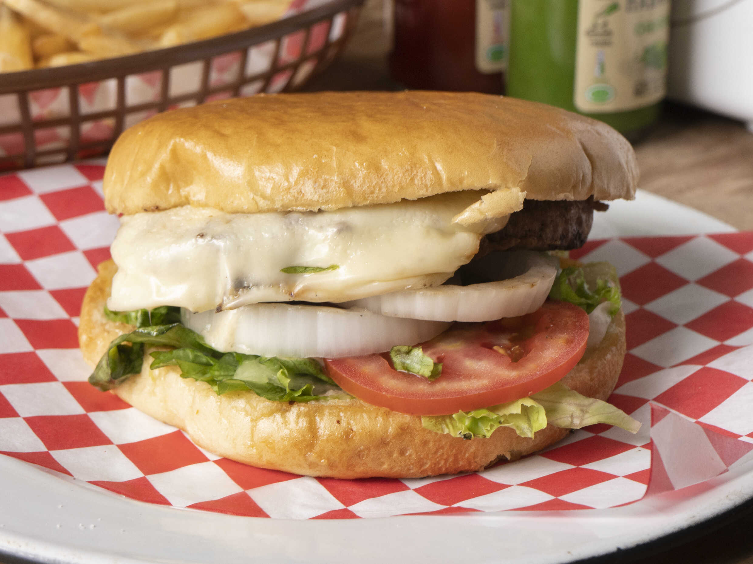 150 gr. de carne sirloin con queso monterrey, lechuga italiana fresca, 2 rodajas de cebolla y tomate.