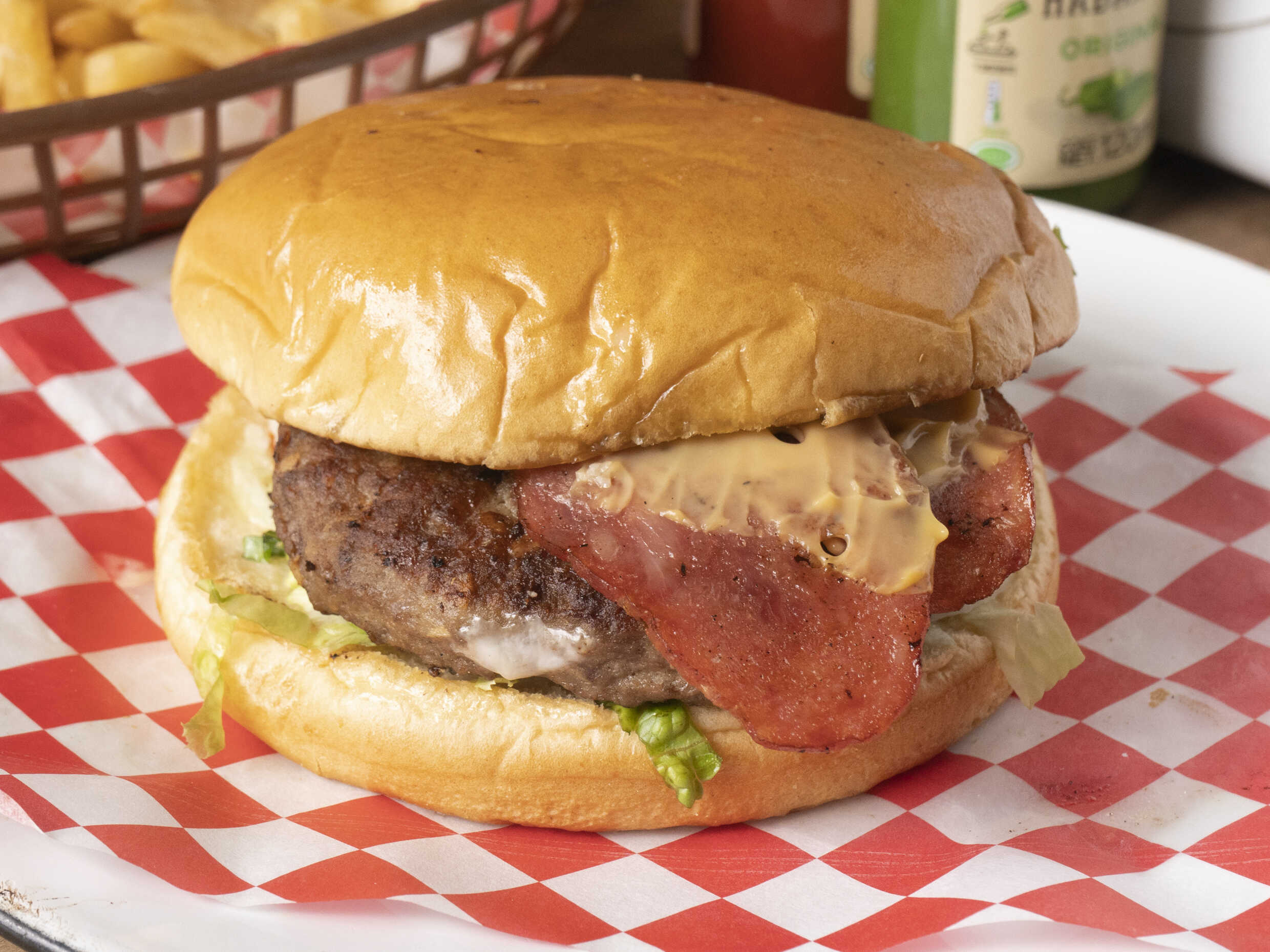 Carne sirloin, 2 rebanadas de tocino ahumado, queso cheddar derretido con lechuga italiana, tomate y cebolla.