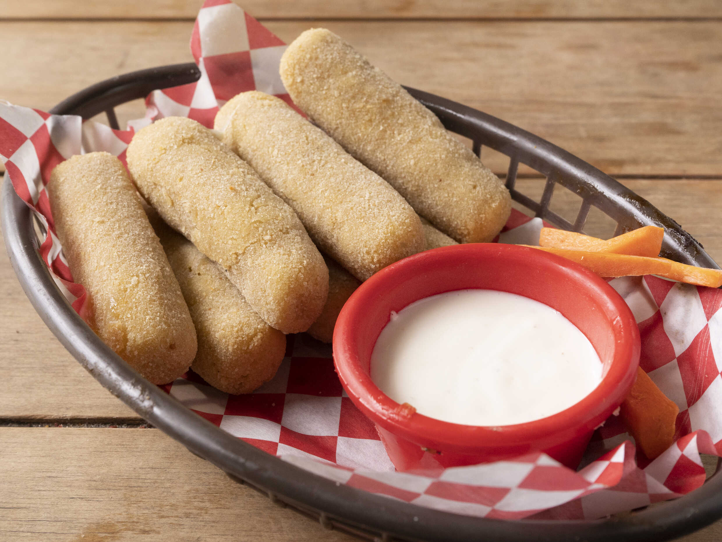 7 Dedos de queso mozzarella empanizados con la receta de la casa, servidos con aderezo ranch y palitos de zanahoria ideal para compartir.