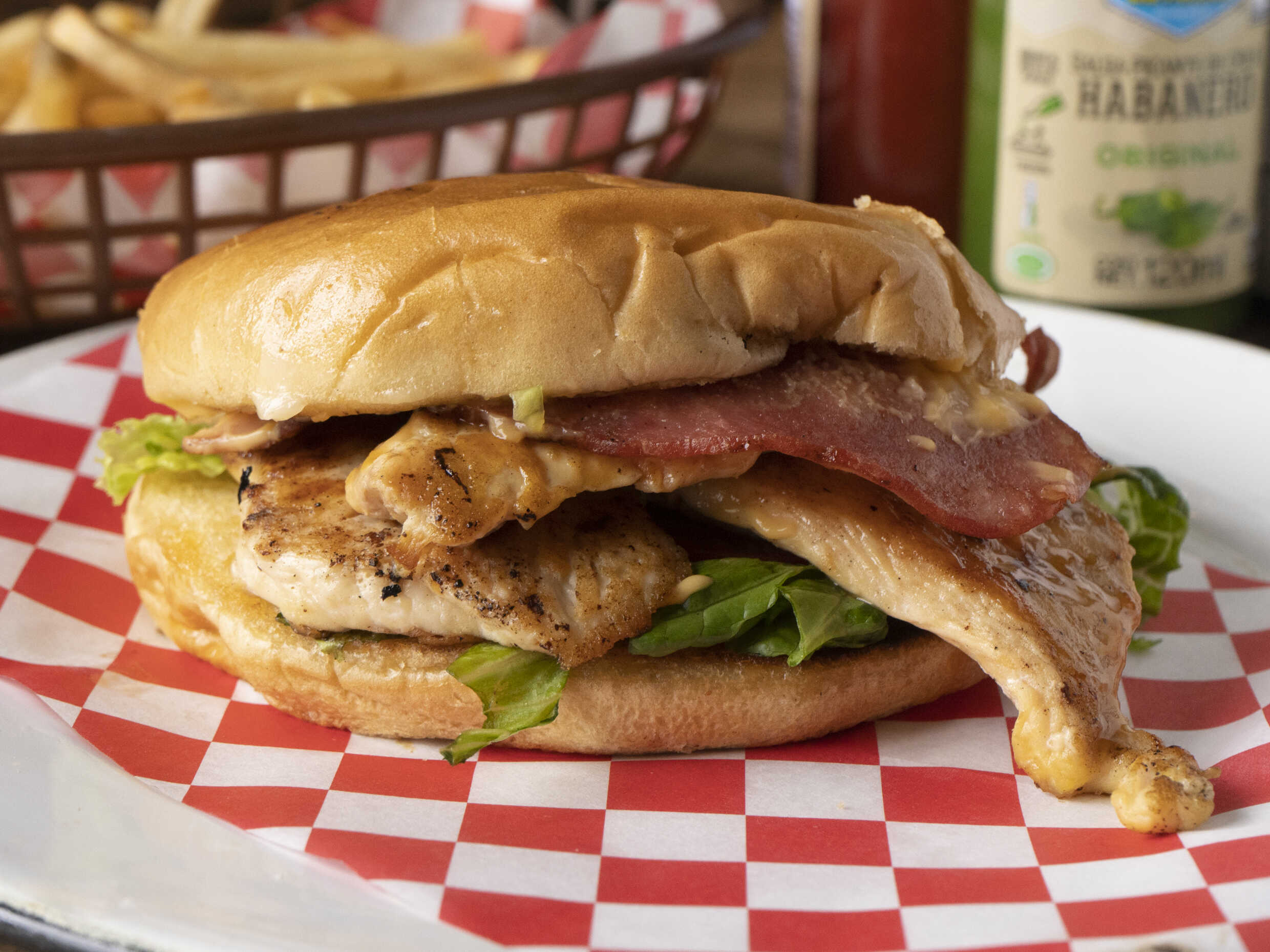 Deliciosa pechuga sazonada a la plancha con queso, barnizada con salsa de mango con 2 jugosas rebanadas de tocino, lechuga fresca, mayonesa y un ligero toque de mostaza.