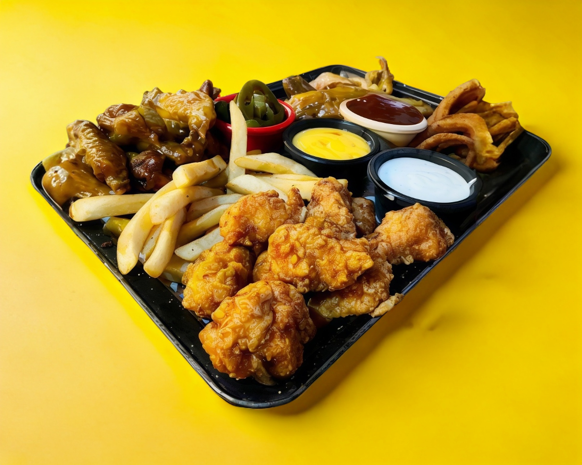 Necesitaras un ejercito para terminarlo, 1 kg. de nuestro delicioso costillar, 10 alitas, 10 boneless, báñalos en la salsa que prefieras, 7 dedos de queso, papas a la francesa y papas cheese bacon gratinadas con chorizo y tocino, 10 aros de cebolla y nachos gratinados con arrachera.