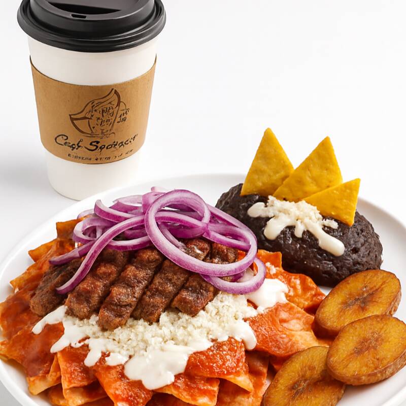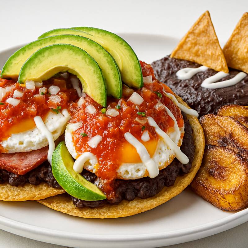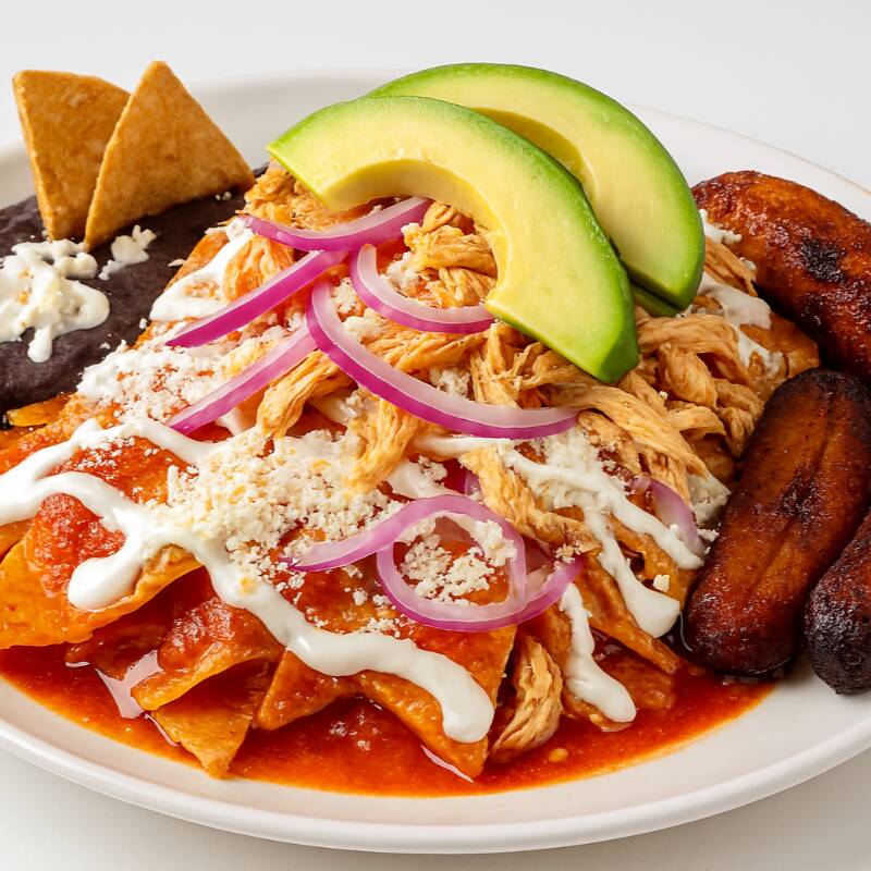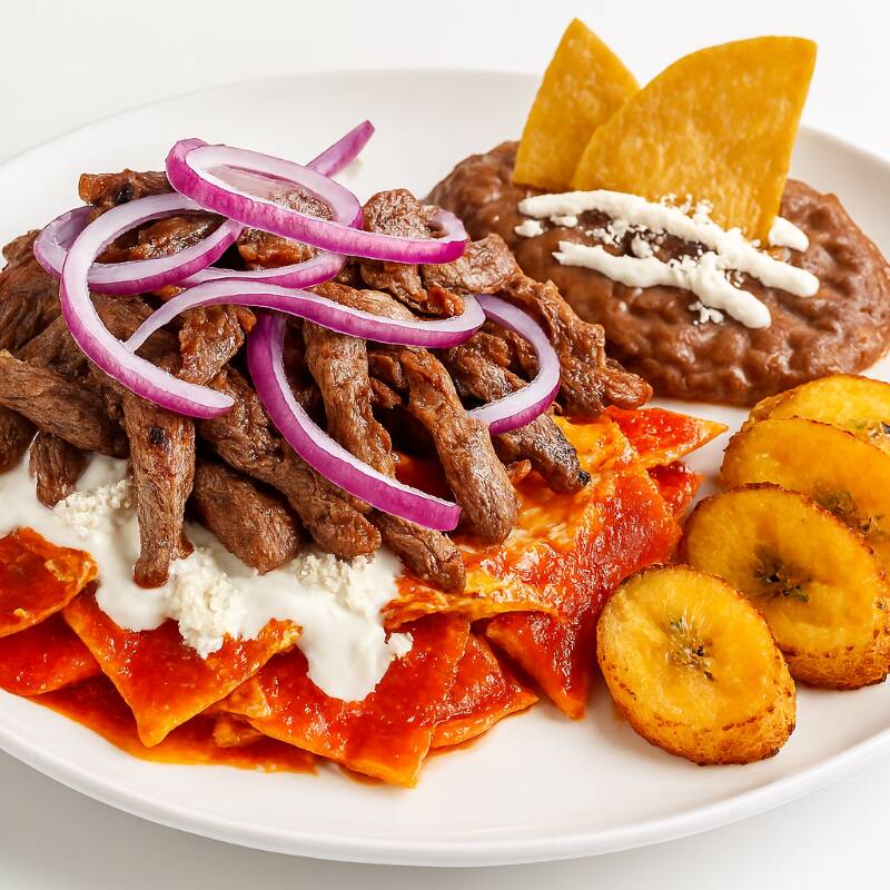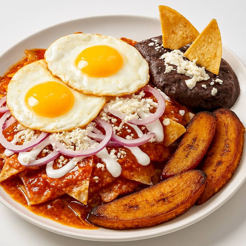 tortilla de maiz frita bañada en salsa , con cebolla , crema y queso doble crema coronada con huevos estrellados incluye plátanos y frijol