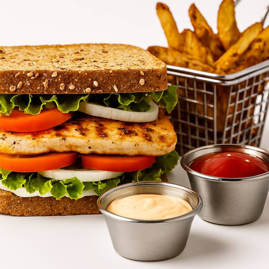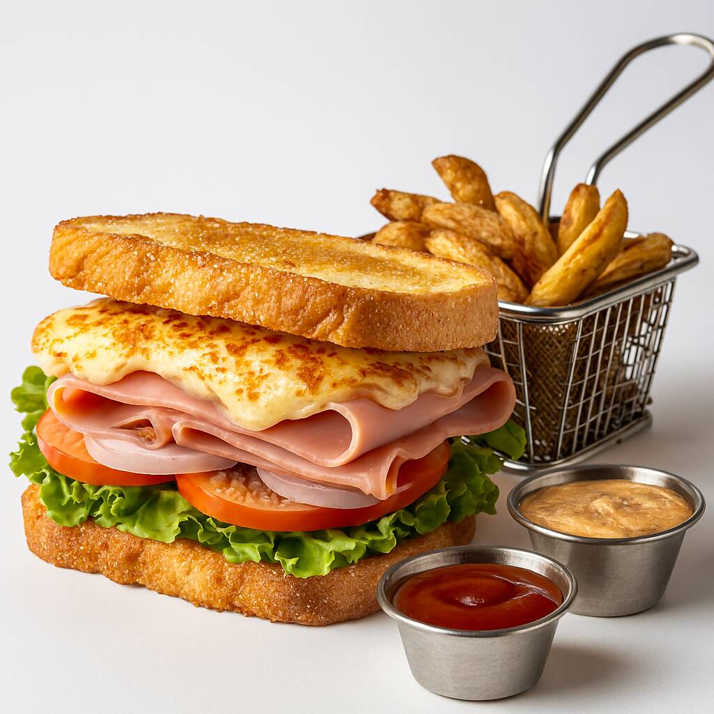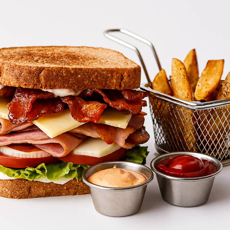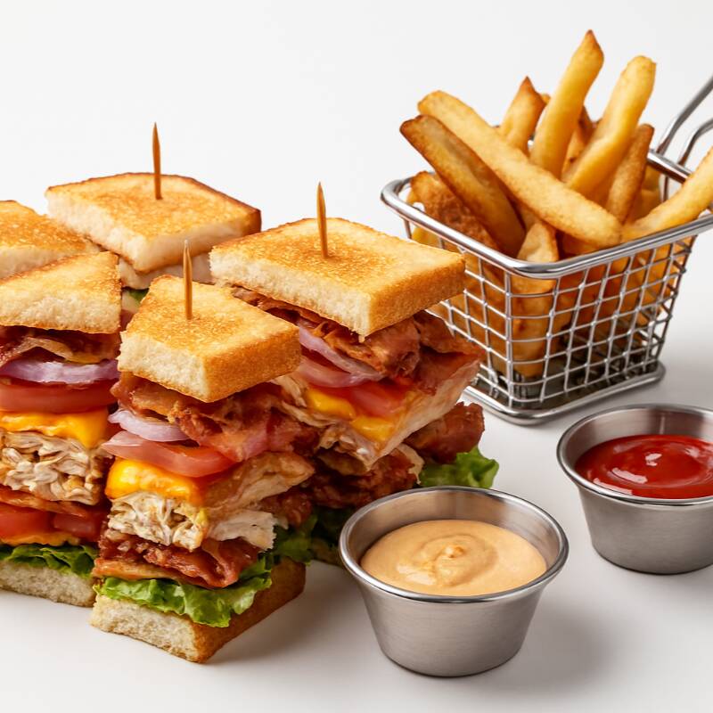 Torre de tres pisos con pollo, tocino, jamón, queso y mix de lechuga. Acompañando de papas a la francesa.