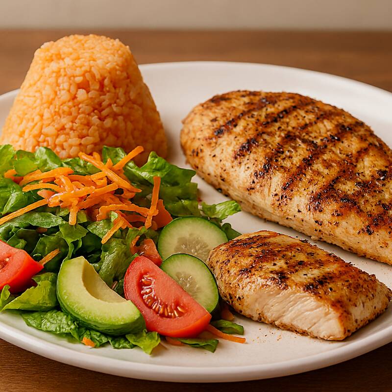 Incluye papas a la francesa. Pollo a la plancha, tomate, lechuga y aguacate.