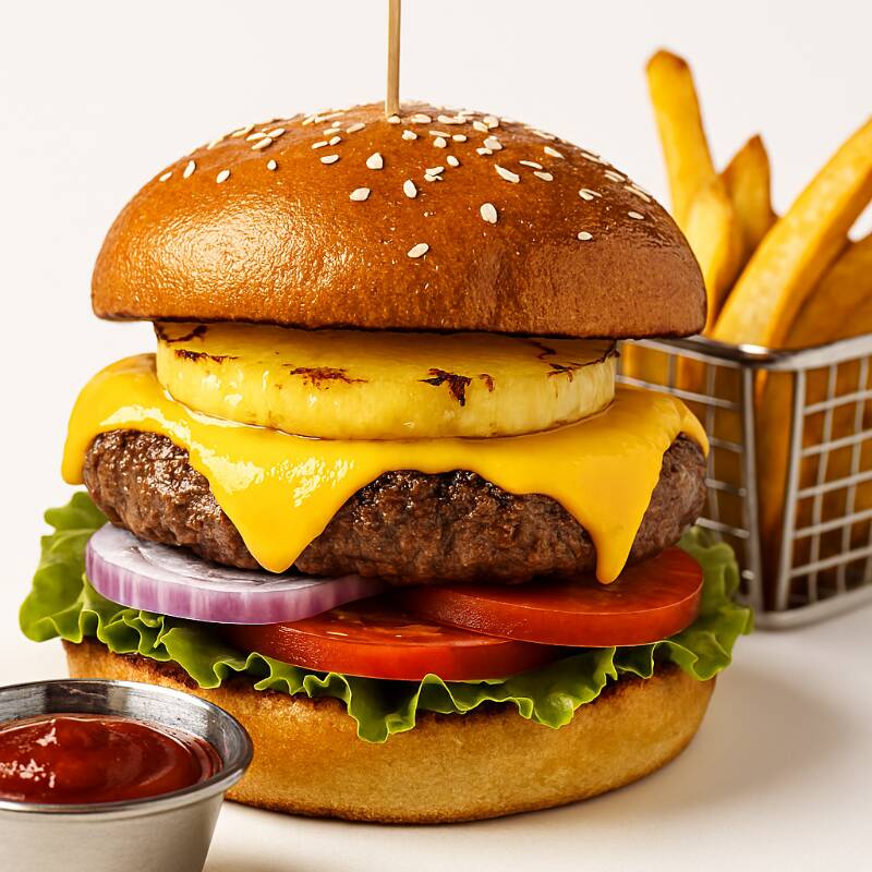 deliciosa hamburguesa de carne angus con queso amarilla con rodaja de piña