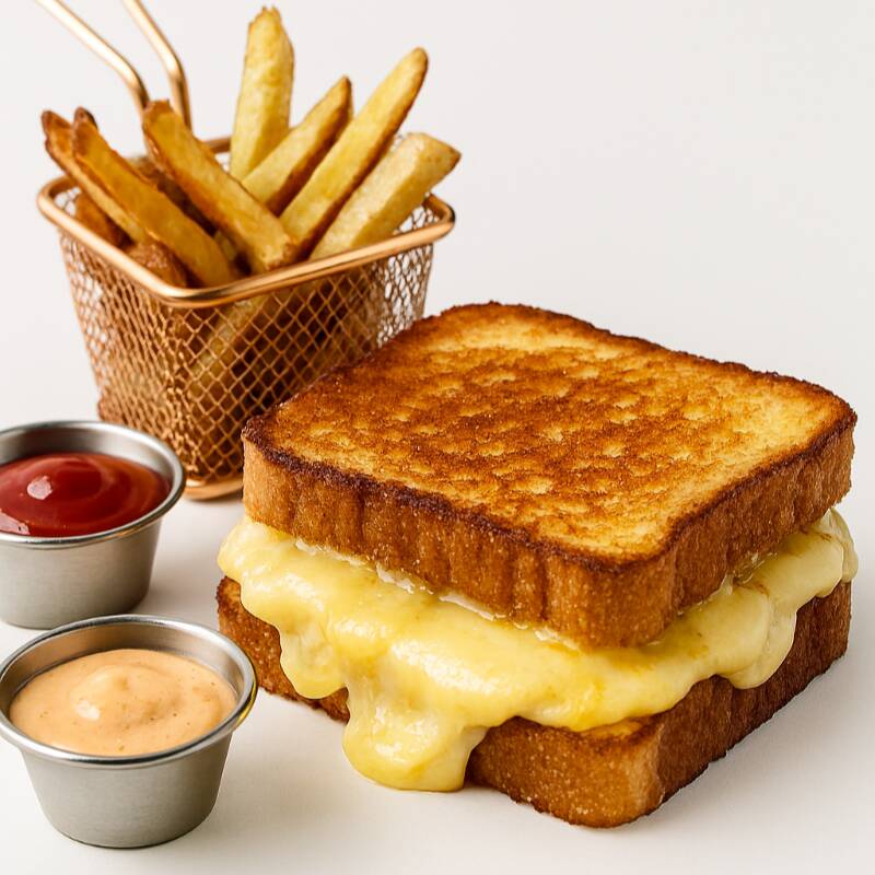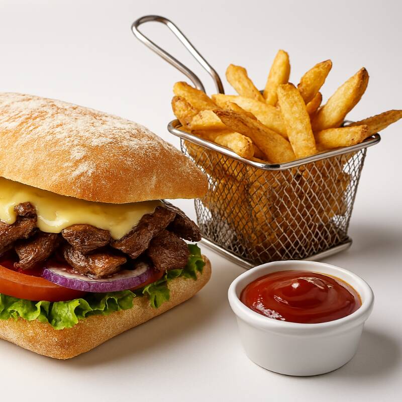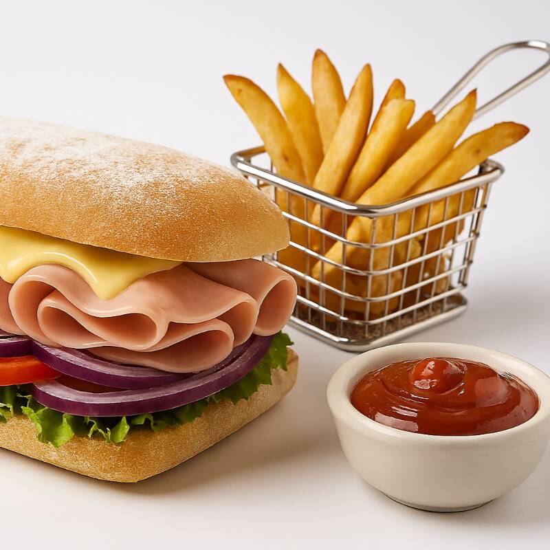 Acompañado de papas a la francesa. Jamón de pavo, pesto y queso manchego o gouda. Barra de pan ancha, aplanada y rectangular, con poca miga y corteza muy crujiente.
